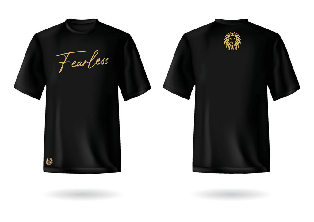 Fearless Gold Signature design T, gold print across front & gold lion print small on bottom corner & larger on back of neck